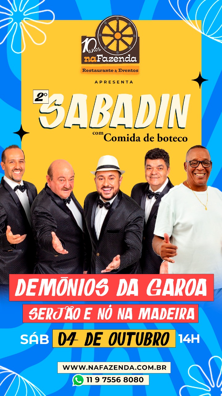 No Dia 04 Outubro de 2025 = Sábado, a partir das 14h, nossa 2ª edição do SABADIN Na Fazenda e no palco a Banda Demônios da Garoa...